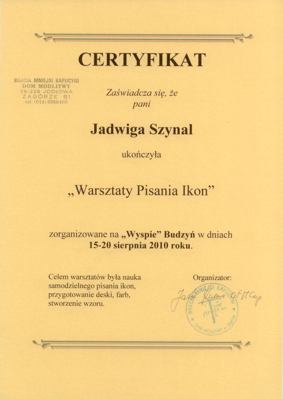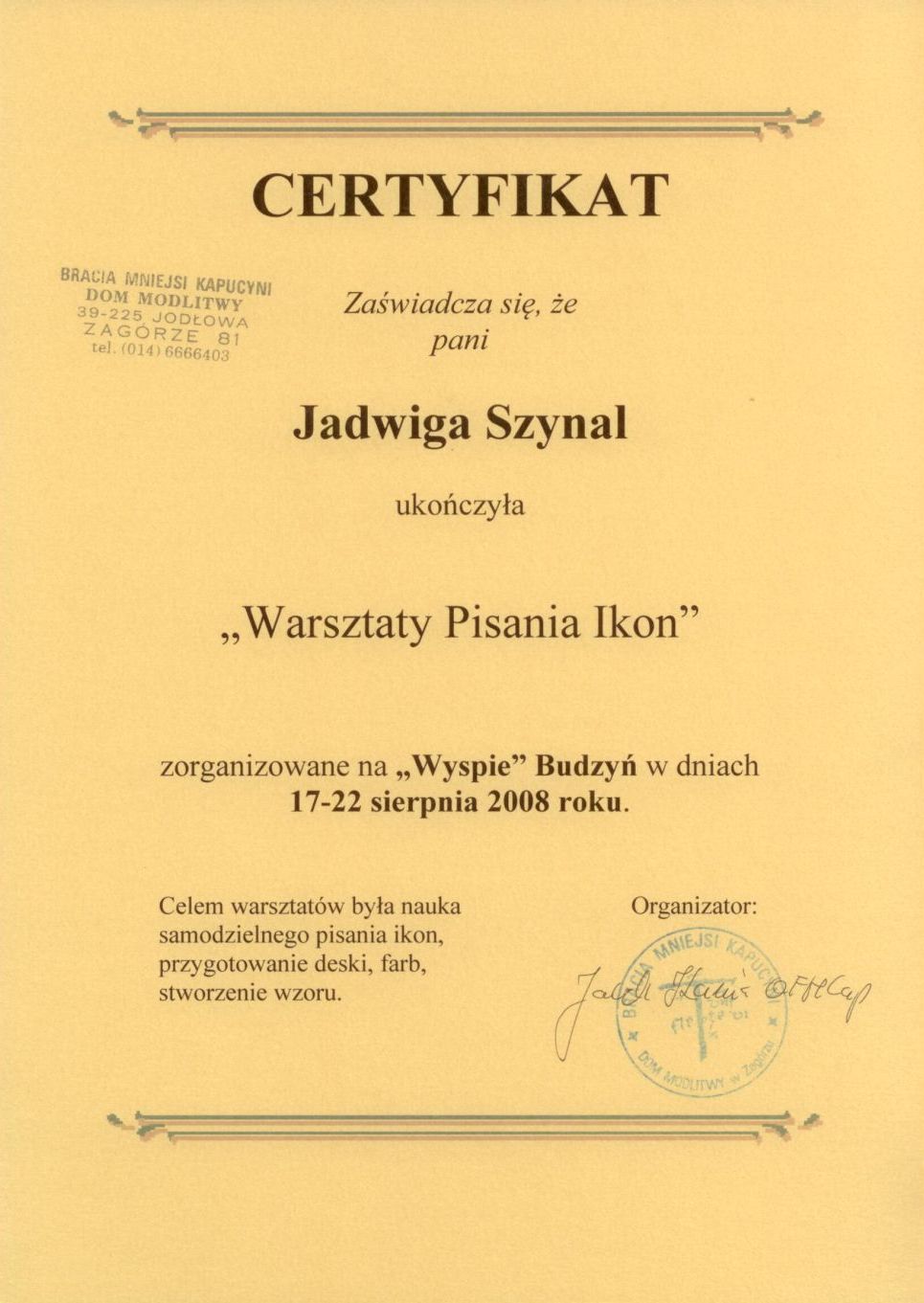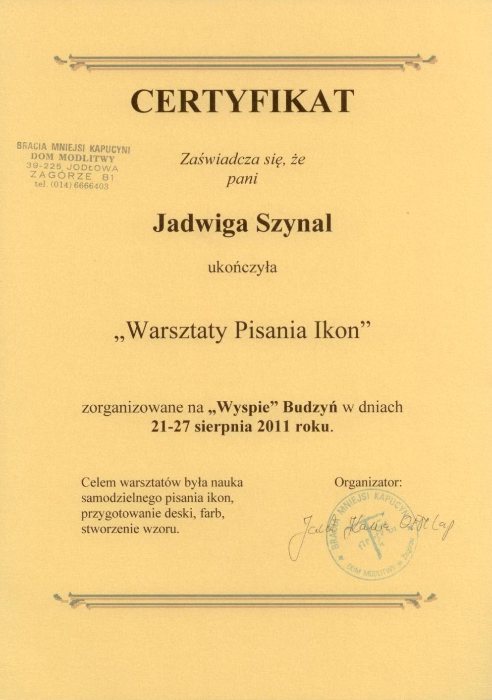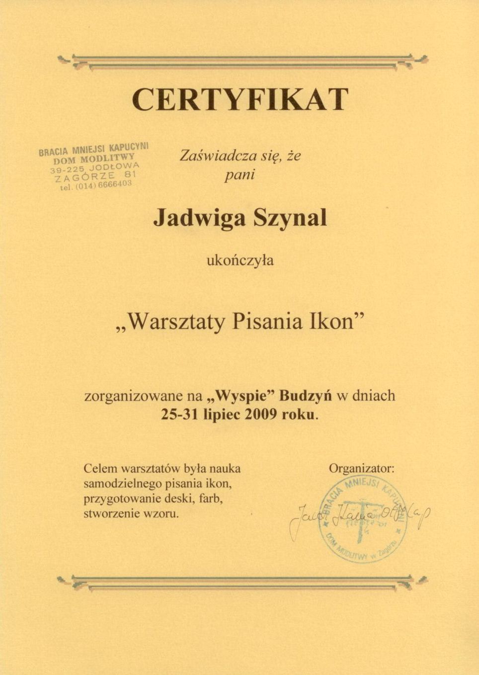 Jednakże informacje jakie udzielił mi brat nie były w zupełności wystarczające do rozpoczęcia samodzielnego pisania ikon. Wieć w celu podniesienia swoich umiejętności odbyłam kilka kursów w Budzyniu.